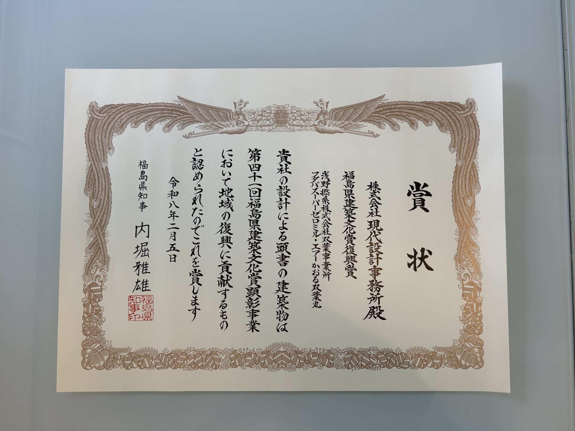 2026.02.18 弊社設計の浅野撚糸株式会社様施設「フタバスーパーゼロミル」が福島県の建築文化賞・復興賞受賞 高吸水タオルを手がける浅野撚糸株式会社様(安八郡安八町中)が運営する工場兼観光施設「フタバスーパーゼロミル」(福島県双葉町)が、福島県の第41回建築 文化賞の復興賞を受賞しました。